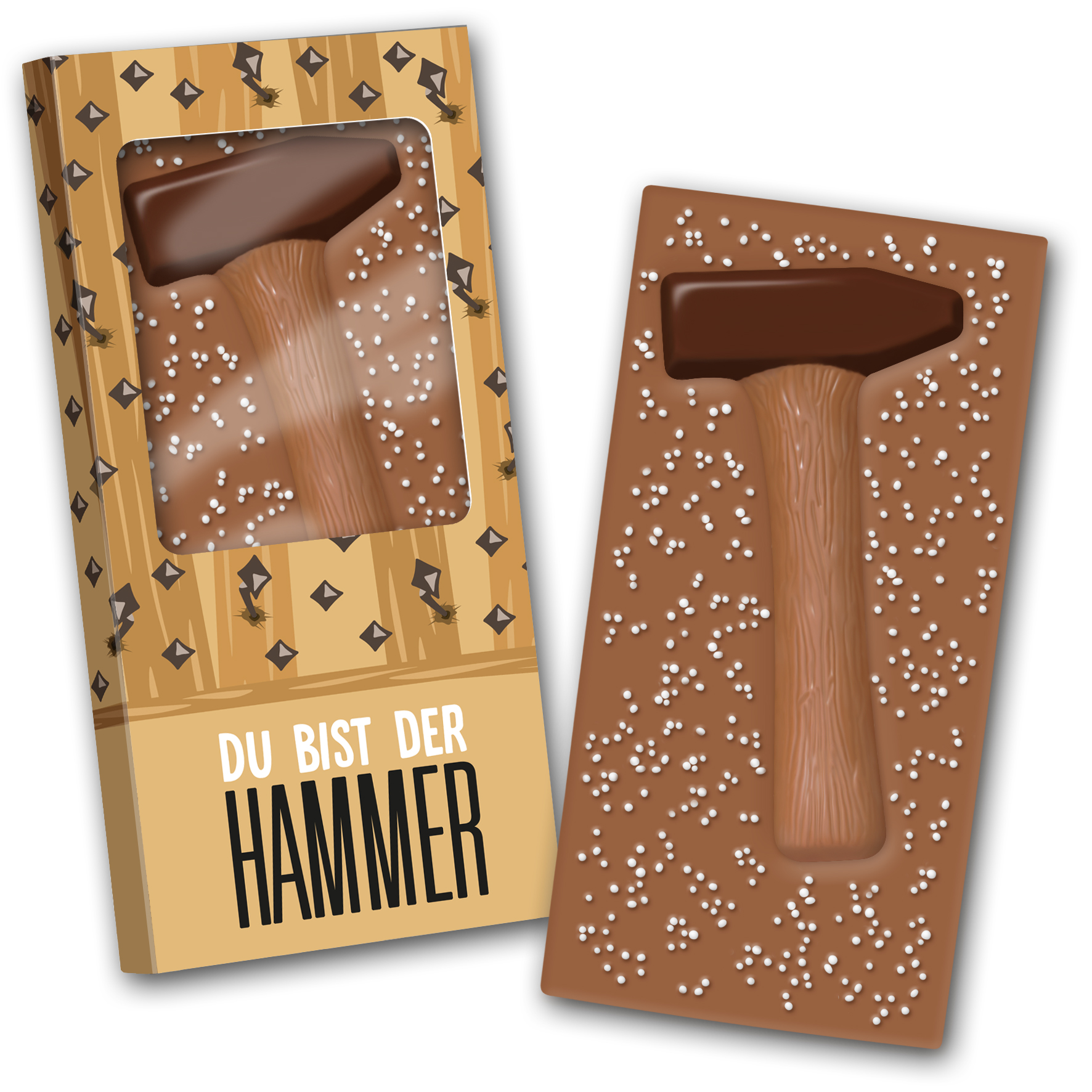Schokotafel aus handgeschöpfter Edelvollmilch-Schokolade mit mindestens 32% Kakao, einzeln in bedrucktem Karton verpackt.