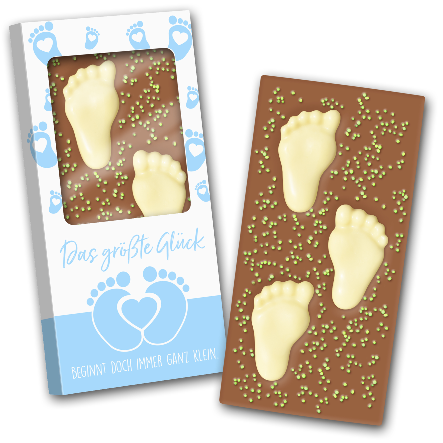 Schokotafel aus handgeschöpfter Edelvollmilch-Schokolade mit mindestens 32% Kakao, einzeln in bedrucktem Karton verpackt.