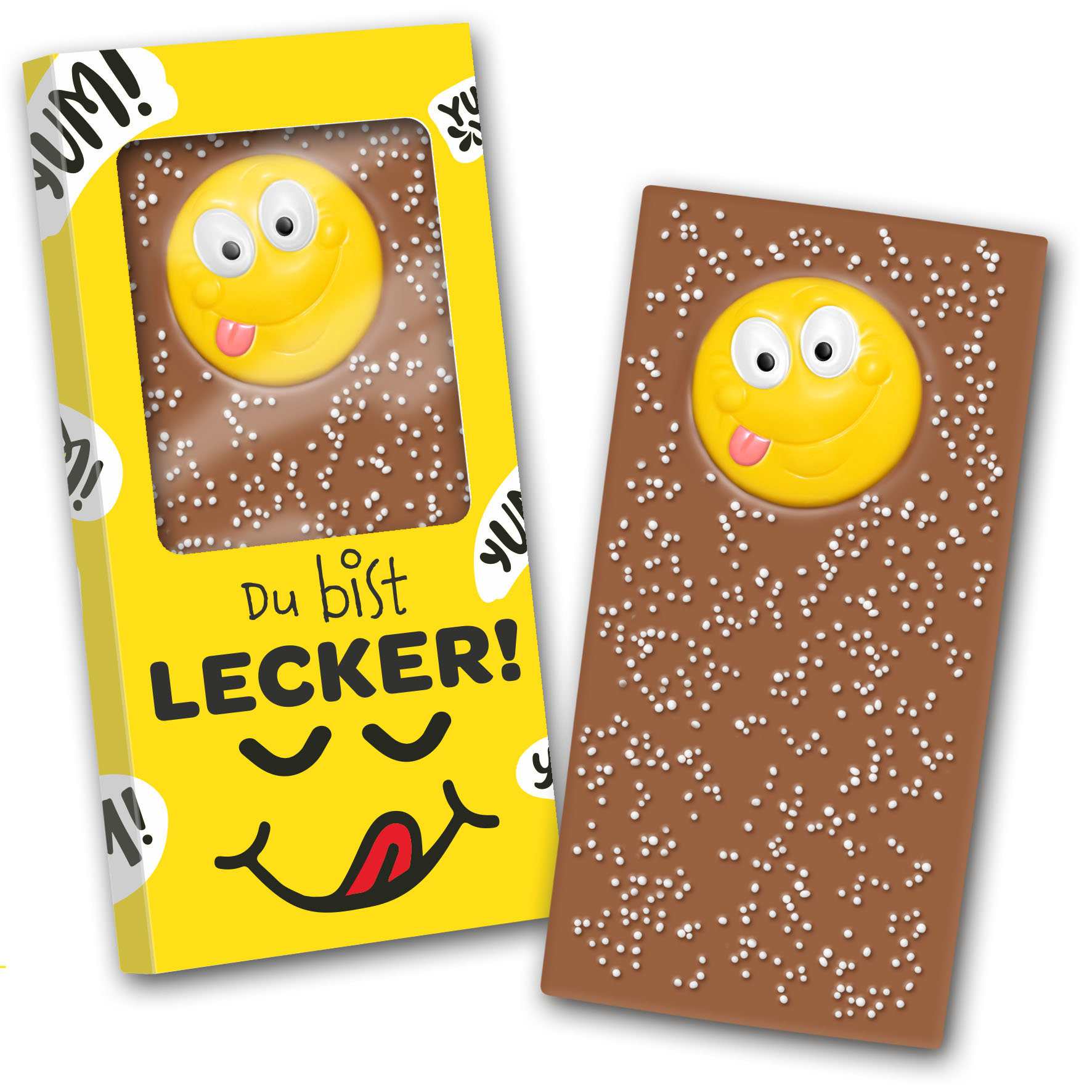 Schokotafel aus handgeschöpfter Edelvollmilch-Schokolade mit mindestens 32% Kakao, einzeln in bedrucktem Karton verpackt.