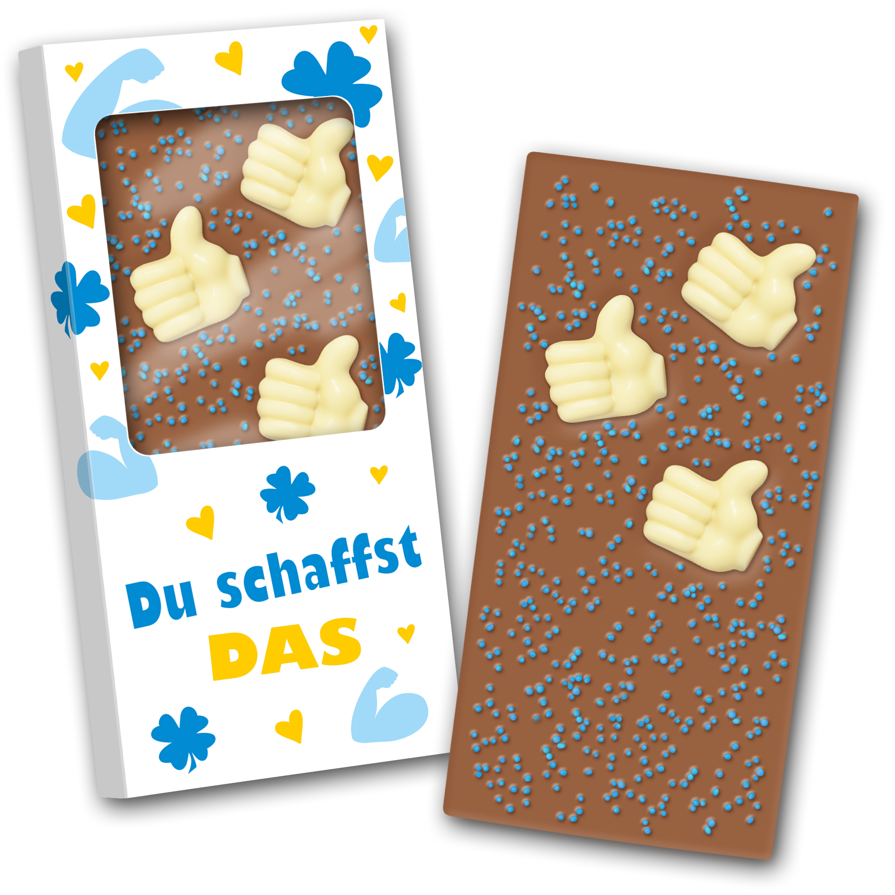 Schokotafel aus handgeschöpfter Edelvollmilch-Schokolade mit mindestens 32% Kakao, einzeln in bedrucktem Karton verpackt.