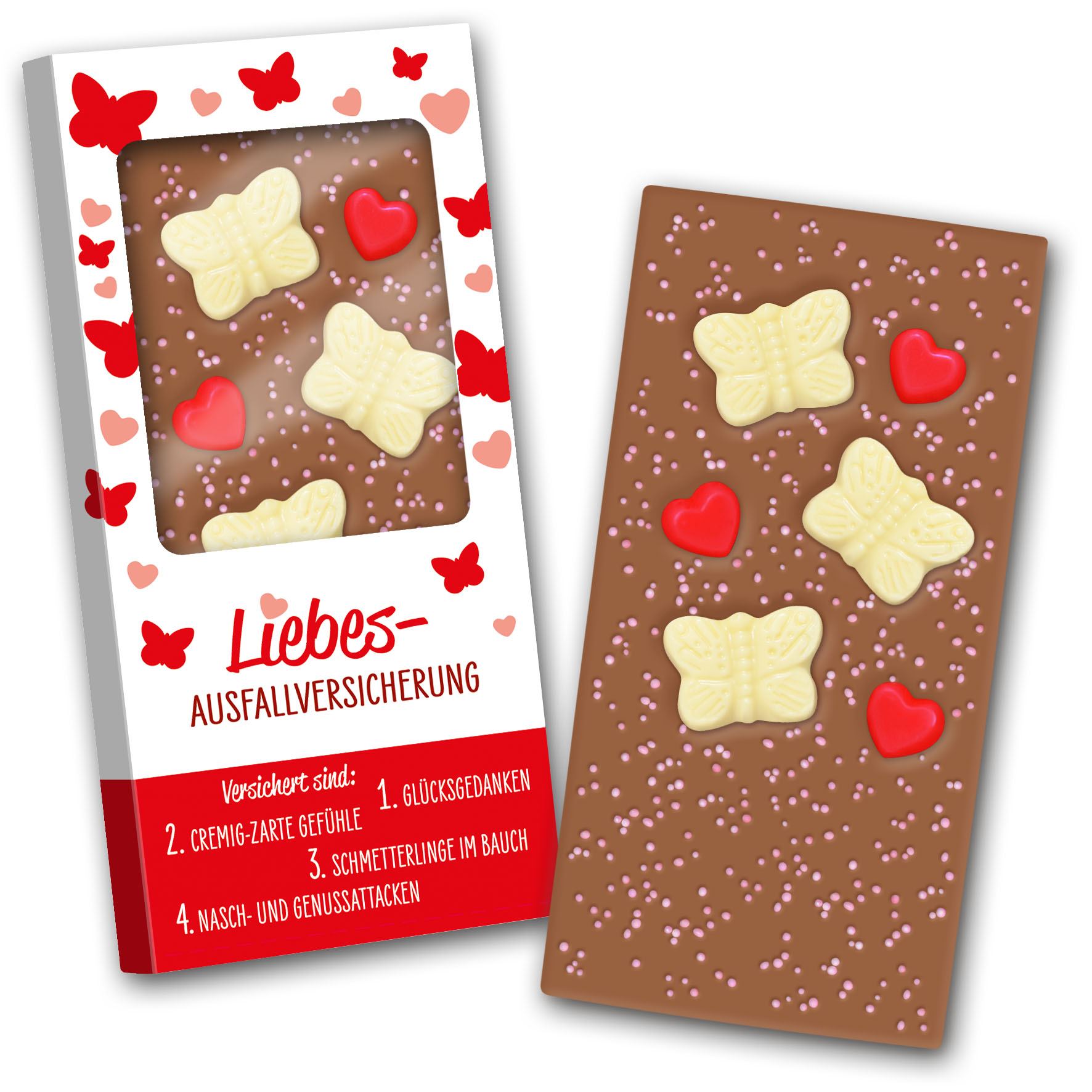 Schokotafel aus handgeschöpfter Edelvollmilch-Schokolade mit mindestens 32% Kakao, einzeln in bedrucktem Karton verpackt.